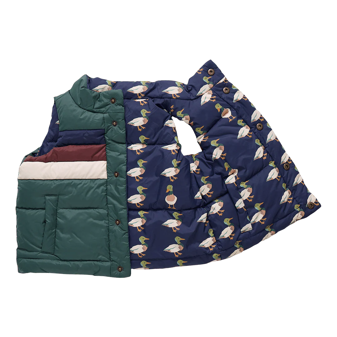 Layer Up! Sometimes a vest is exactly the best option for the adventure you've been planning. And our Evergreen Stripe Kids Reversible Ellis Vest is ready to go whenever you are! Navy, brown and cream stripes against a forest green ground reverse to dapper ducks on a navy interior. Chicken embossed snaps and roomy pockets to keep hands toasty round out the look.