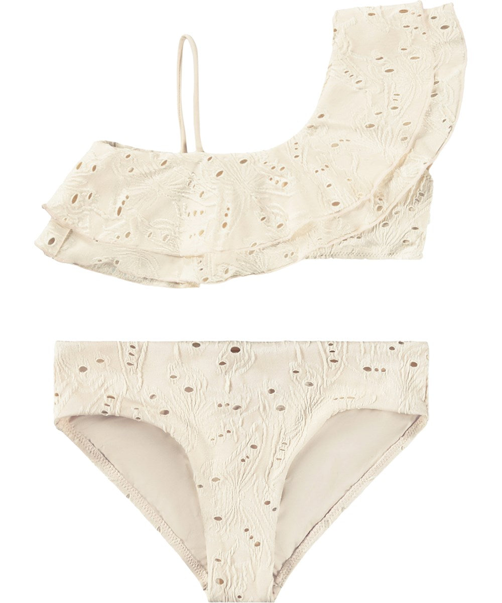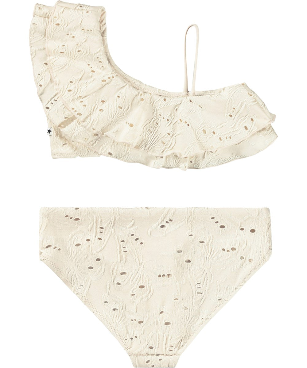 Stretchy bikini in white broderie anglaise, made from recycled polyester with UV protection 50+. The top of the bikini is fully lined and has asymmetrical ruffles, as well as a thin adjustable strap that ensures a good fit. The bottom is fully lined and has a regular fit.
