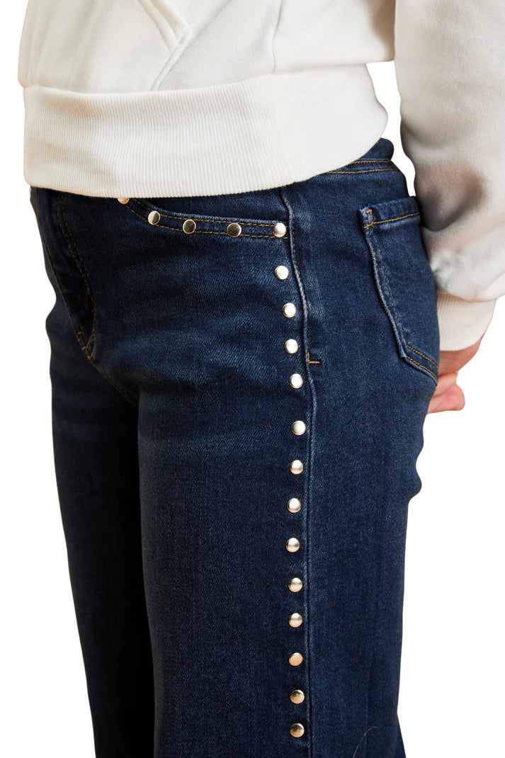 Edgy wide leg pants featuring metallic stud detailing along the side seams for rock-inspired flair. The flowing silhouette balances the bold hardware accents while creating statement-making style.